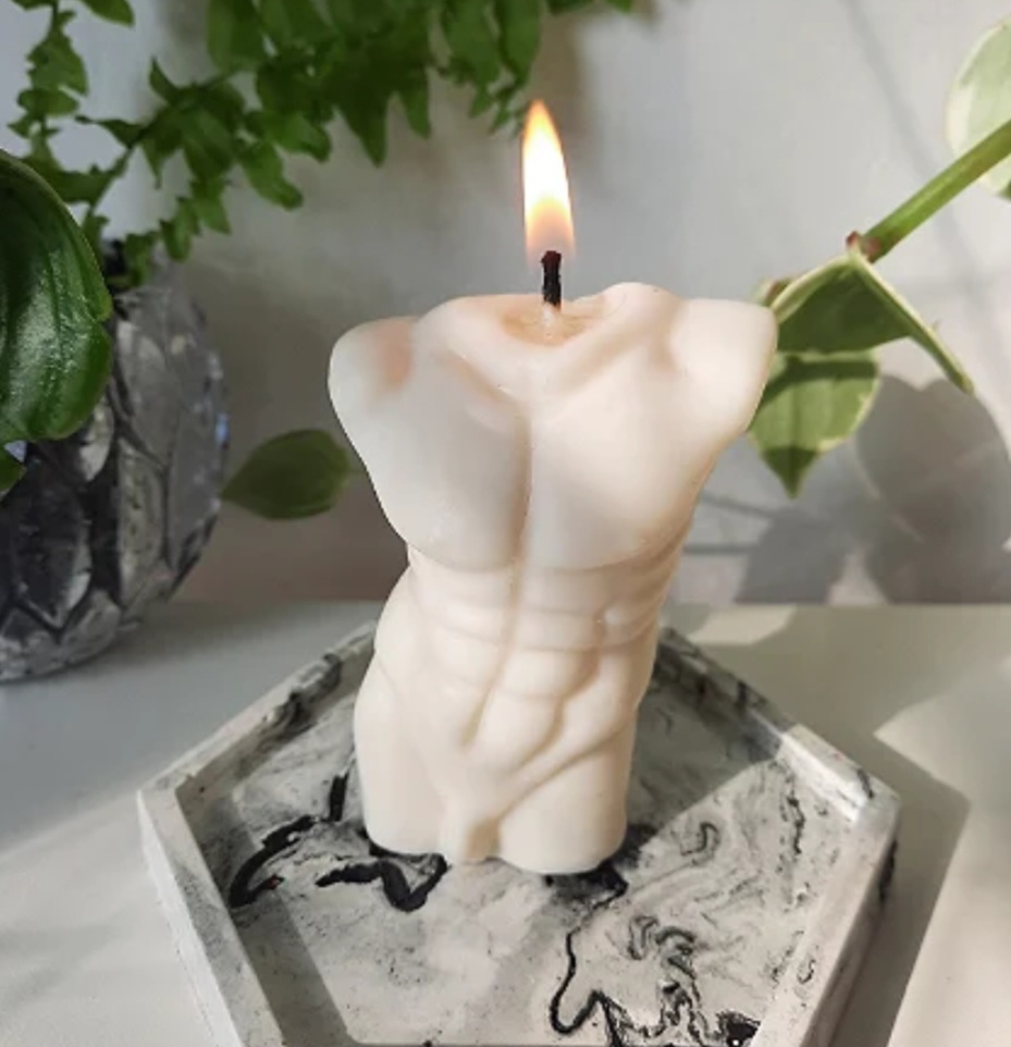 Vela Corpo Homem, feita em cera de soja, aroma e cor, feitas com Poder, energia e consciência.